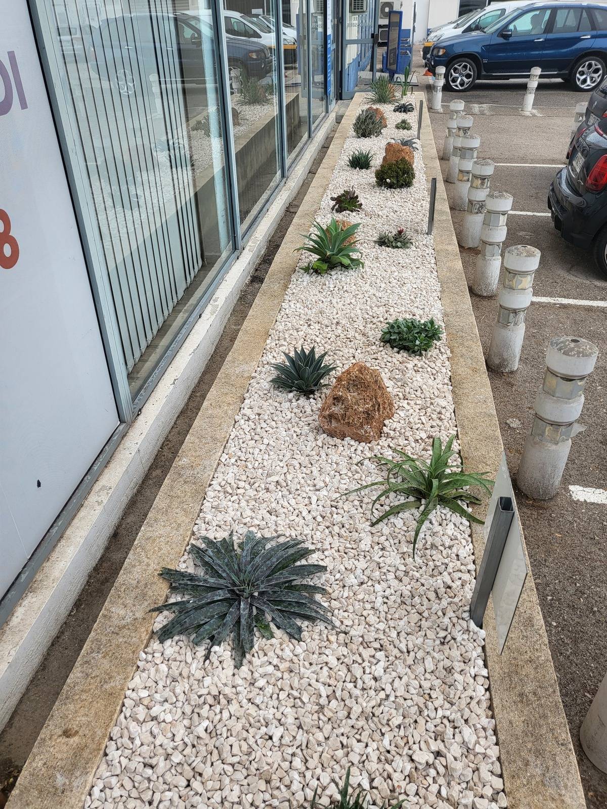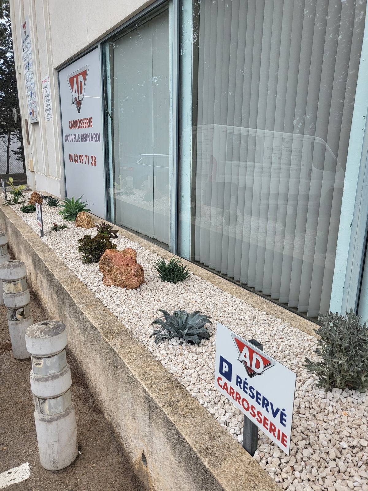 Notre entreprise Les Jardins de Laurent est heureuse de vous présenter l’une de ses dernières réalisations : l’aménagement d’une grande jardinière avec diverses plantations devant un commerce : la carrosserie Nouvelle Bernardi à La Garde 83