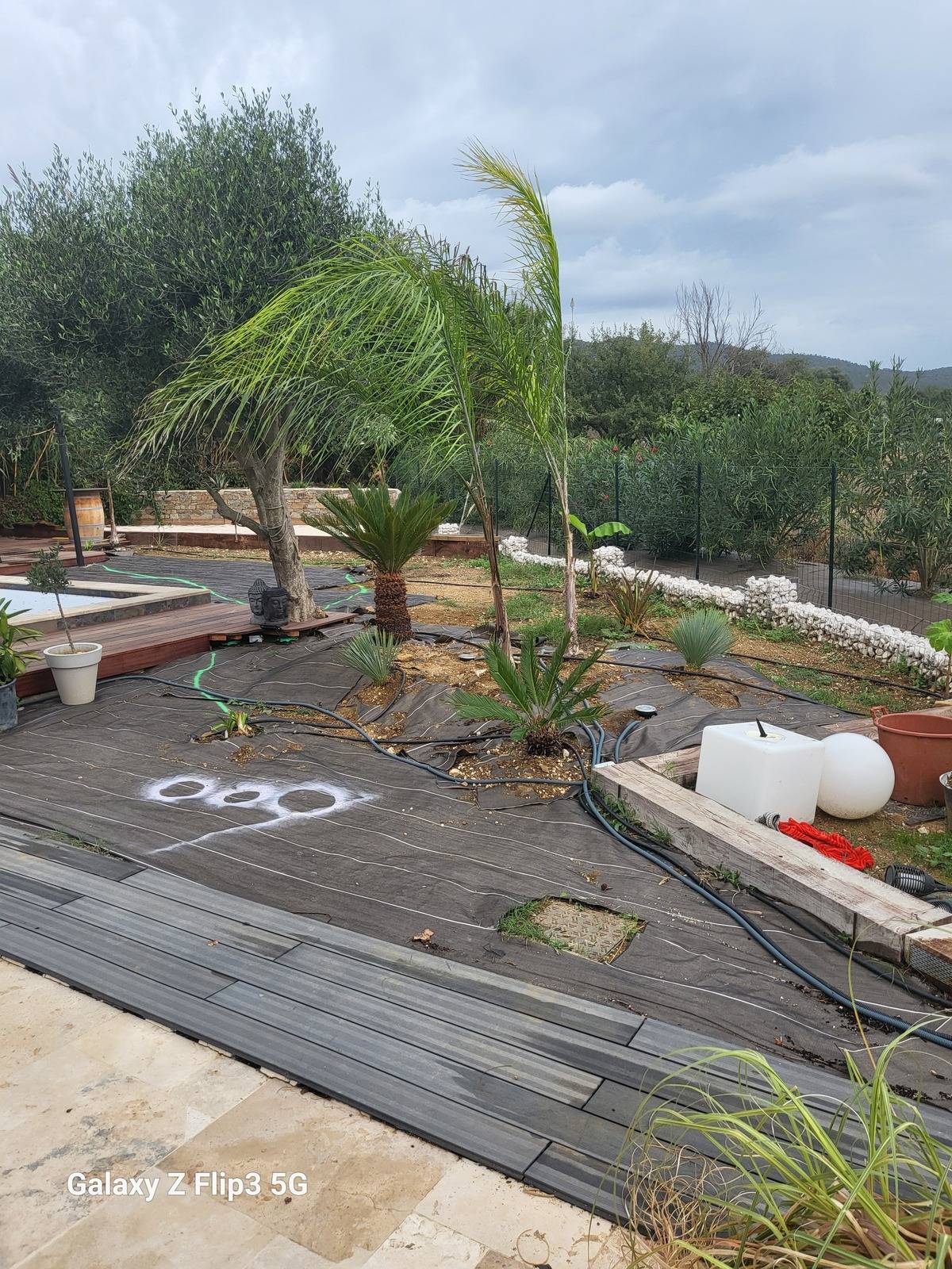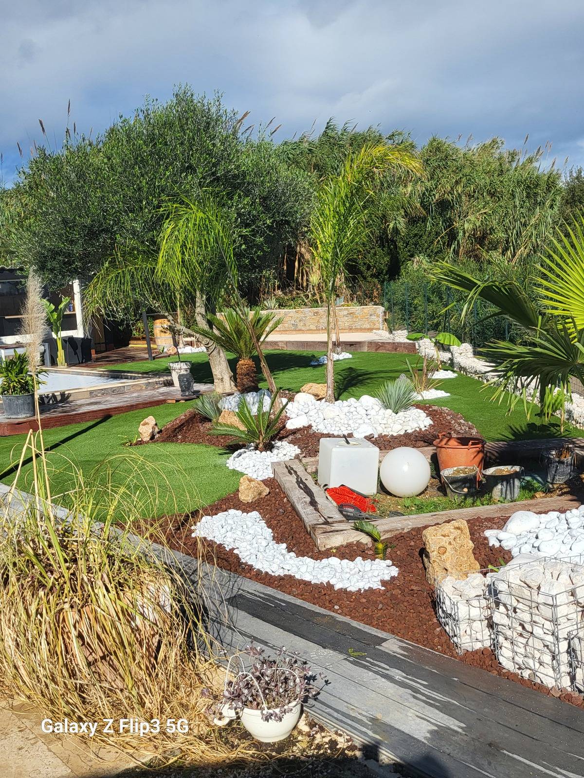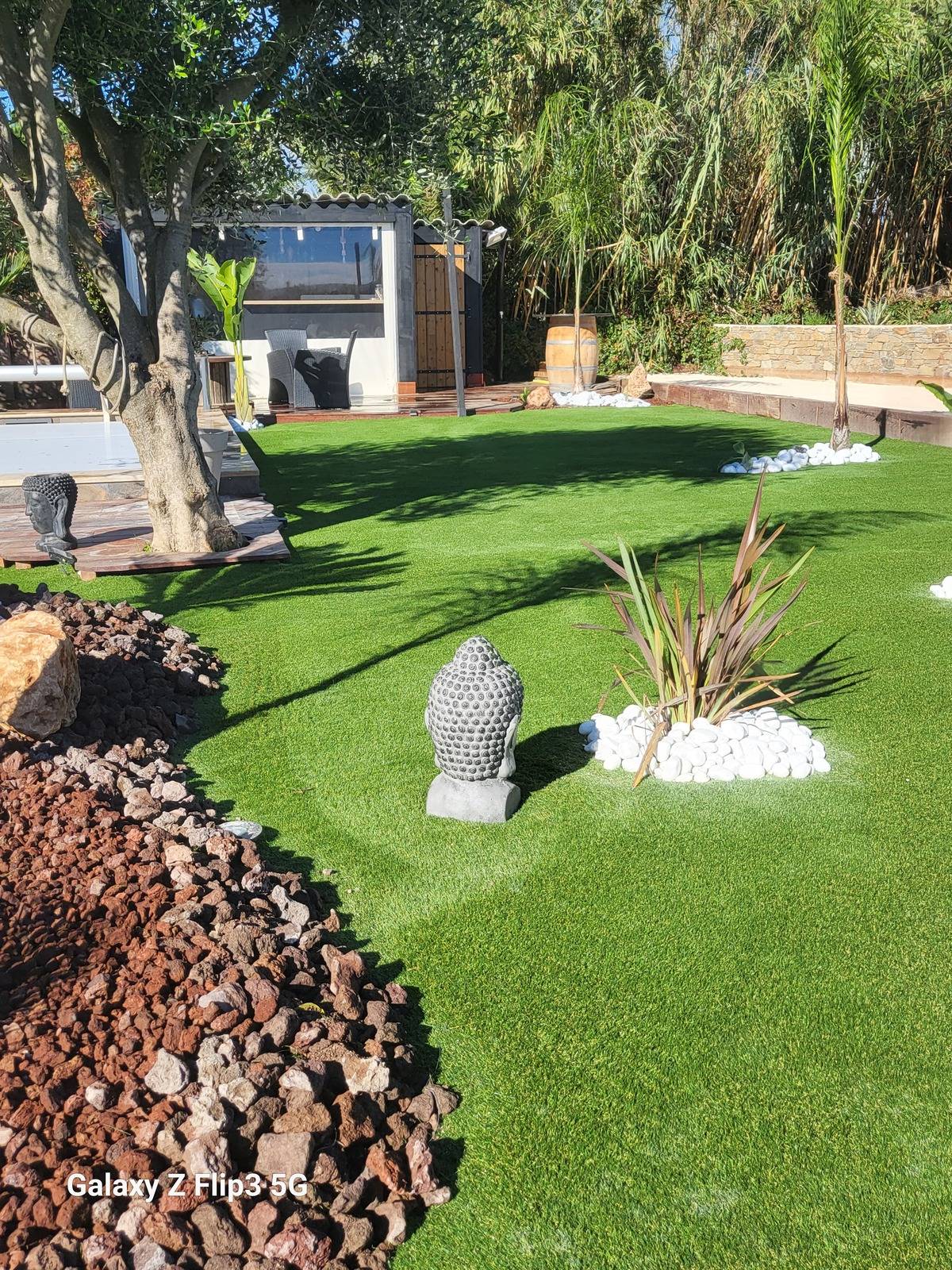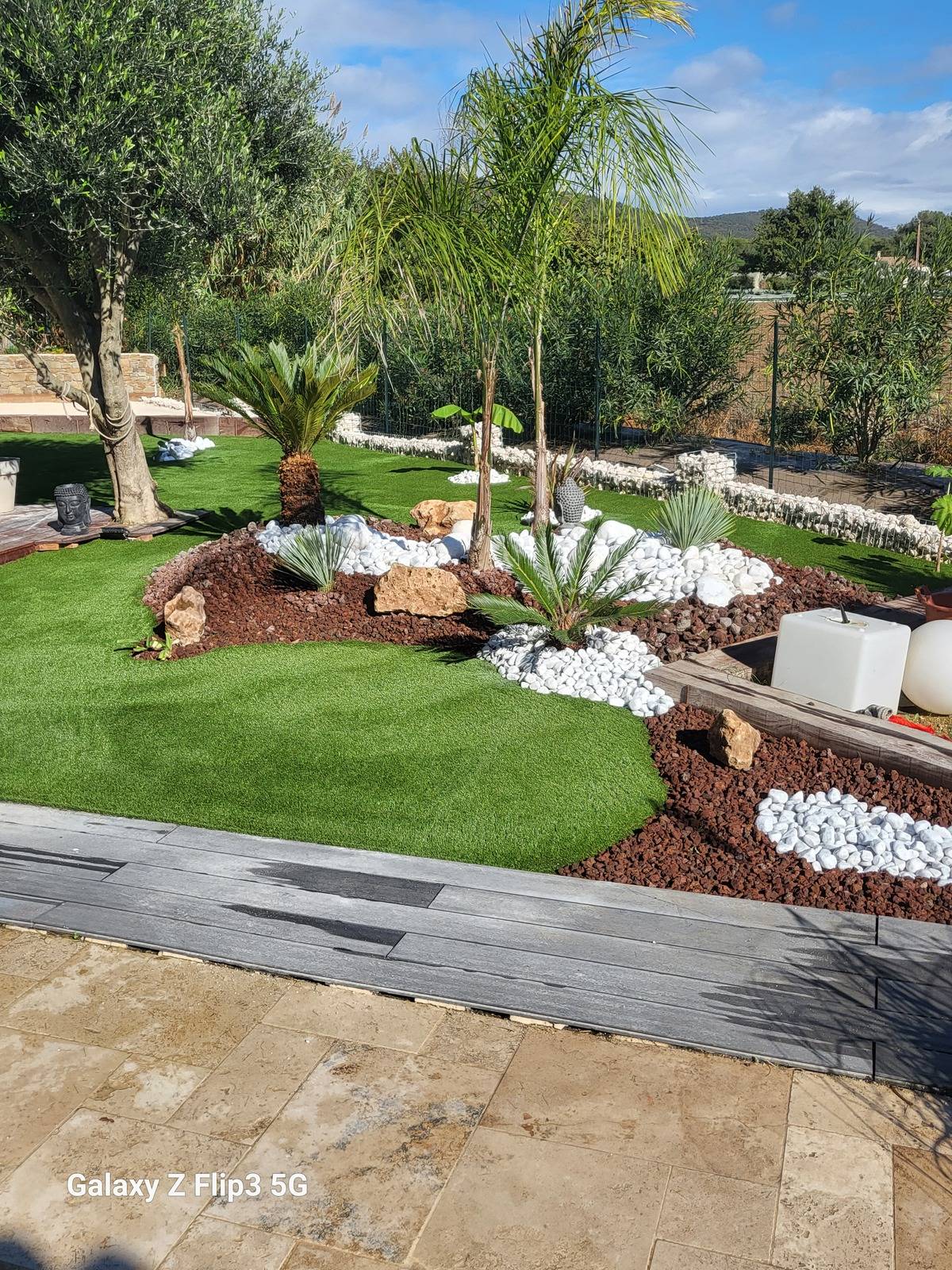 Notre entreprise Les Jardins de Laurent vous présente l’une de ses dernières réalisations : un superbe aménagement paysager dans un jardin à Hyères avec la pose d’un gazon synthétique et la création d’un massif minéral.