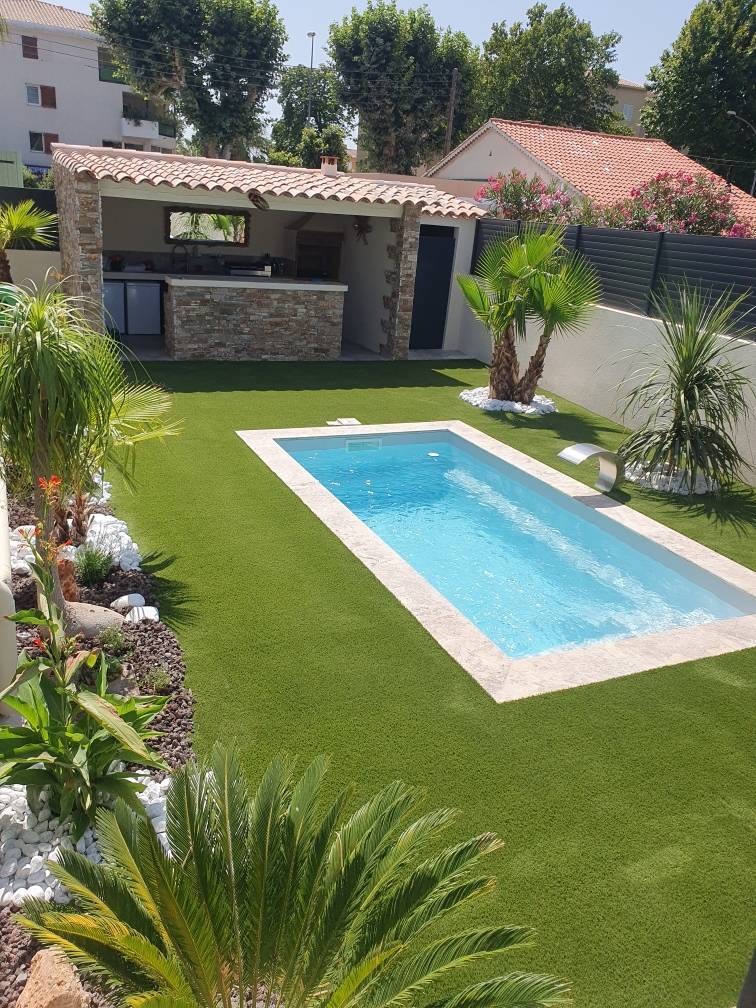 Pour cet aménagement extérieur, nous avons posé une pelouse synthétique de 100 m2 sur les pourtours de la piscine de notre client mais également tout autour de sa maison.