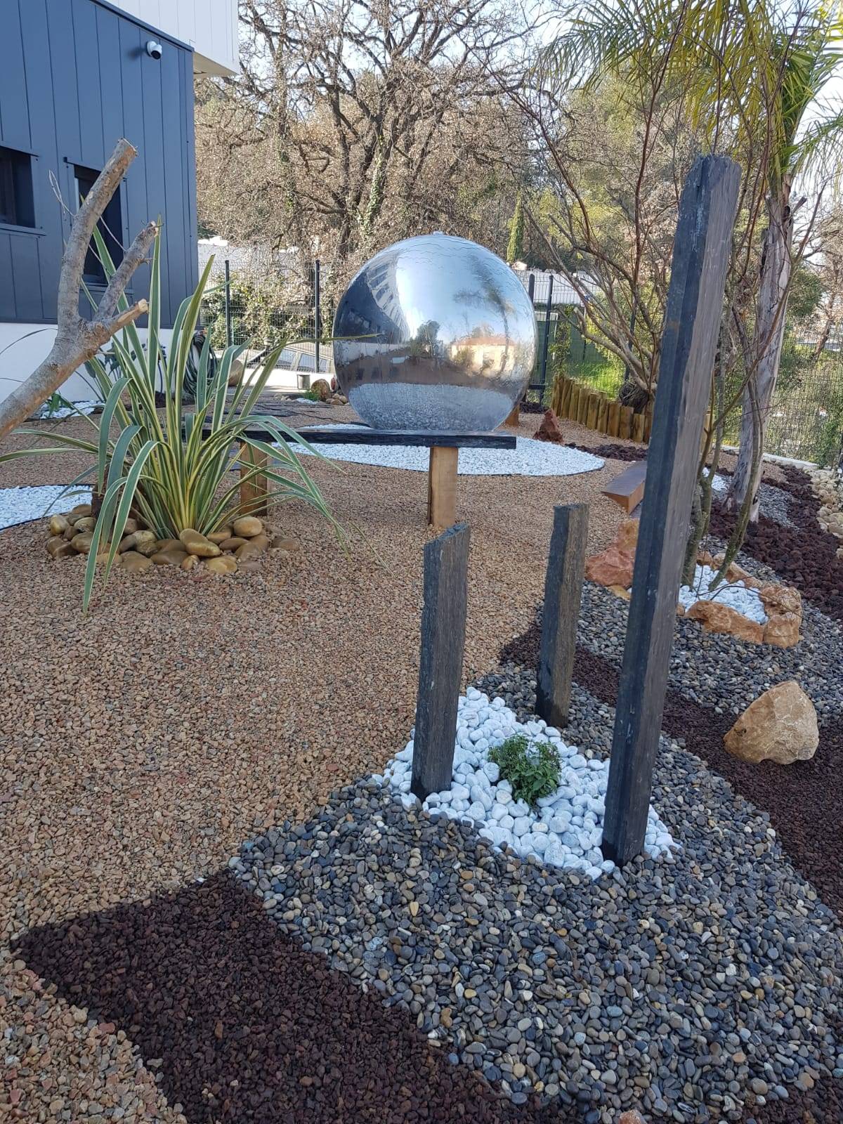 Il a été séduit par notre proposition d'aménagement et à rajouté sa touche personnelle en nous fournissant une fontaine en Inox, haut de gamme d'une beauté rare. Nous avons pu créer autour de cette fontaine un jardin minéralisé, zen et respecté sa demande.