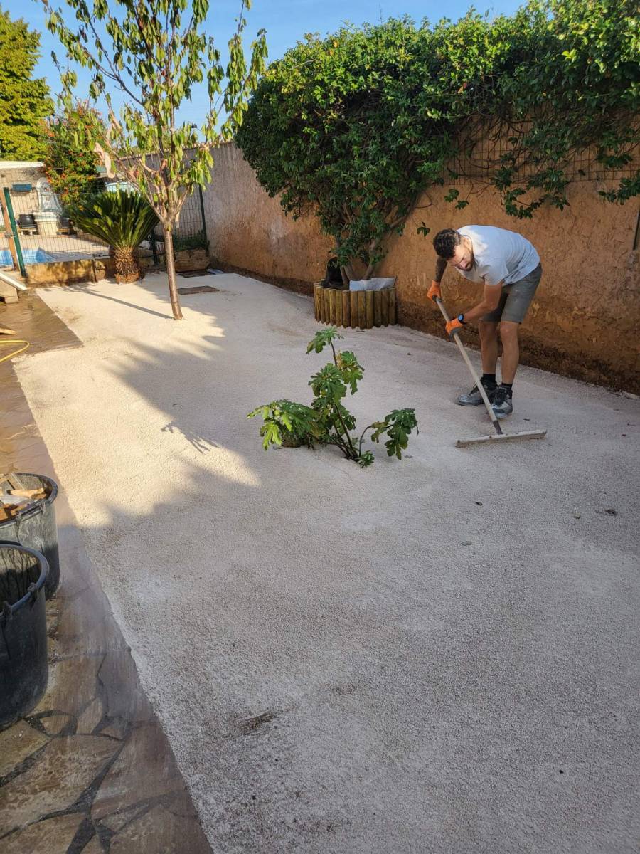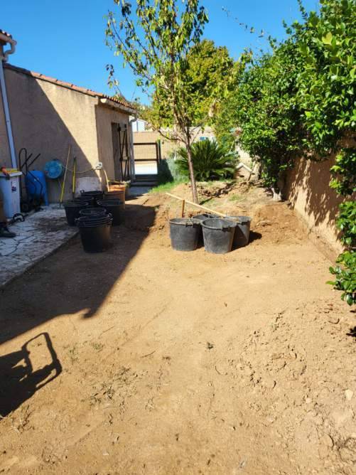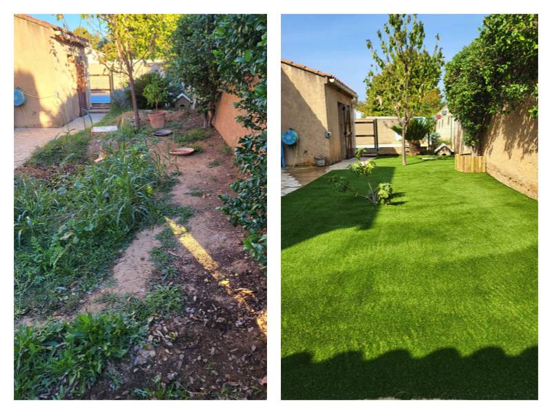 Cette création paysagère avec pelouse synthétique sur terre et géotextile a été effectuée par notre équipe pour des clients habitants à La Crau. Nous avons réalisé des travaux de terrassement manuel pour la mise à niveau d'un terrain de 45 m2 plus haut que les allées autour de la maison, et sans accès pour le passage d'une mini pelle.