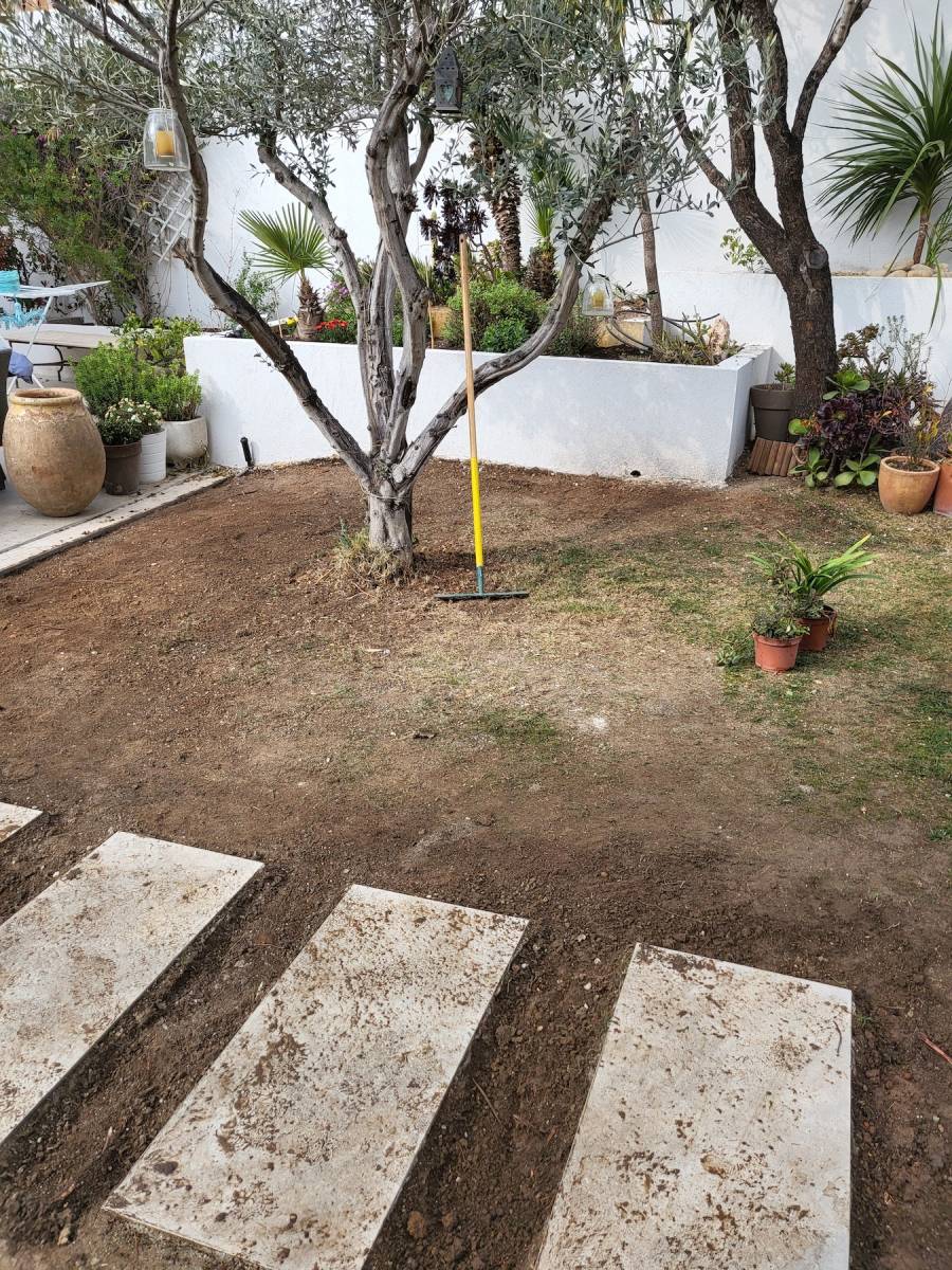 Pour y remédier nous avons effectué une pose de gazon en rouleau sur une superficie de 100m2, sur un terrain meuble préalablement enrichi, et aplani.