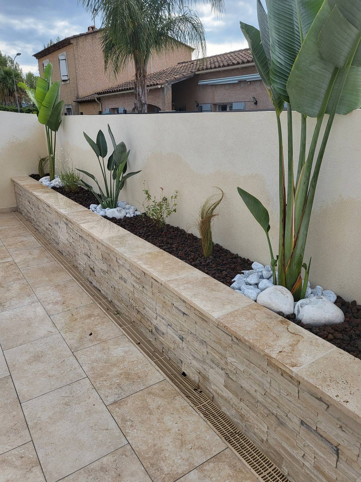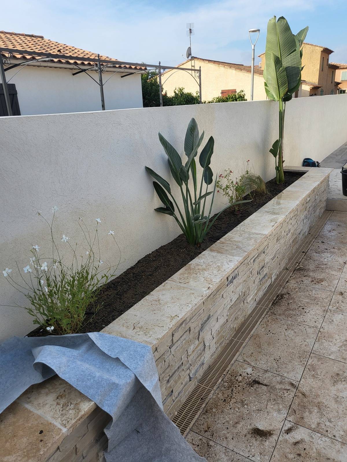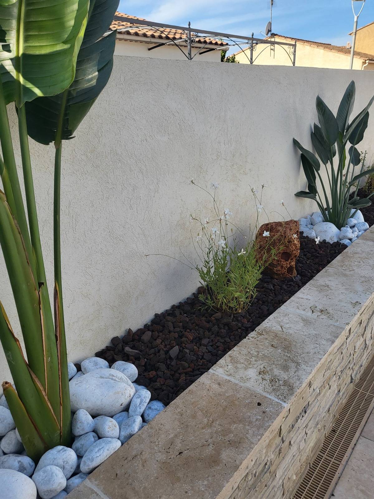 Nous avons, en guise de finitions, recouvert la jardinière par un géotextile anti mauvaises herbes et des minéraux de la Crau : pouzzolane et galets décoratifs blancs de différentes tailles.